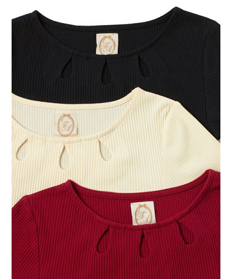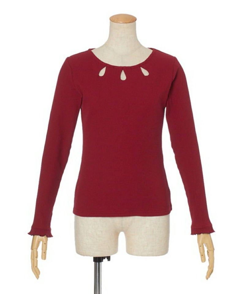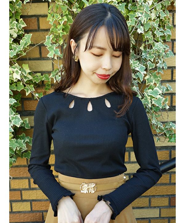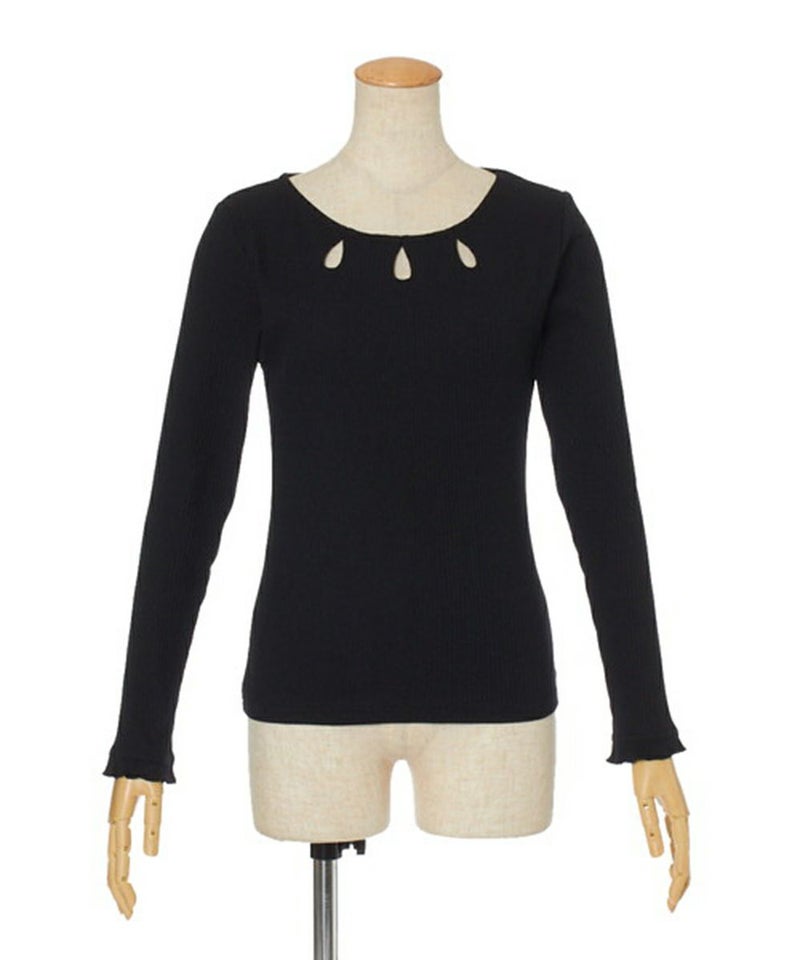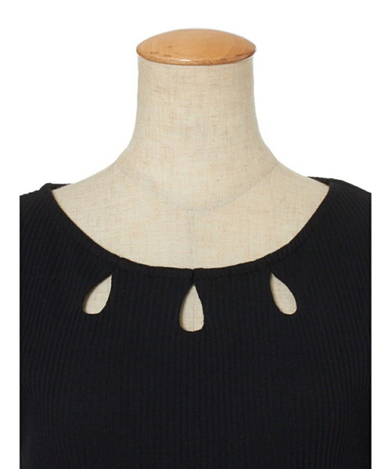 衿ぐりに涙開きが施された、カットソートップス。