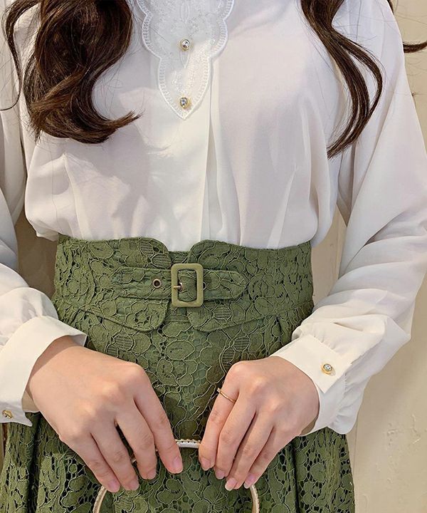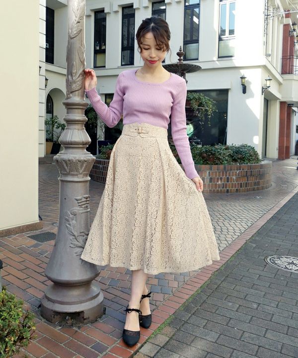 スカートのライン、丈、レースの感じ、色、とても上品で素敵です。 異素材同色で合わせたかったので、同色のカーディガンも購入し、大変気に入っています。 手持ちの白っぽいカットソーなどとも相性よく着こなせます。