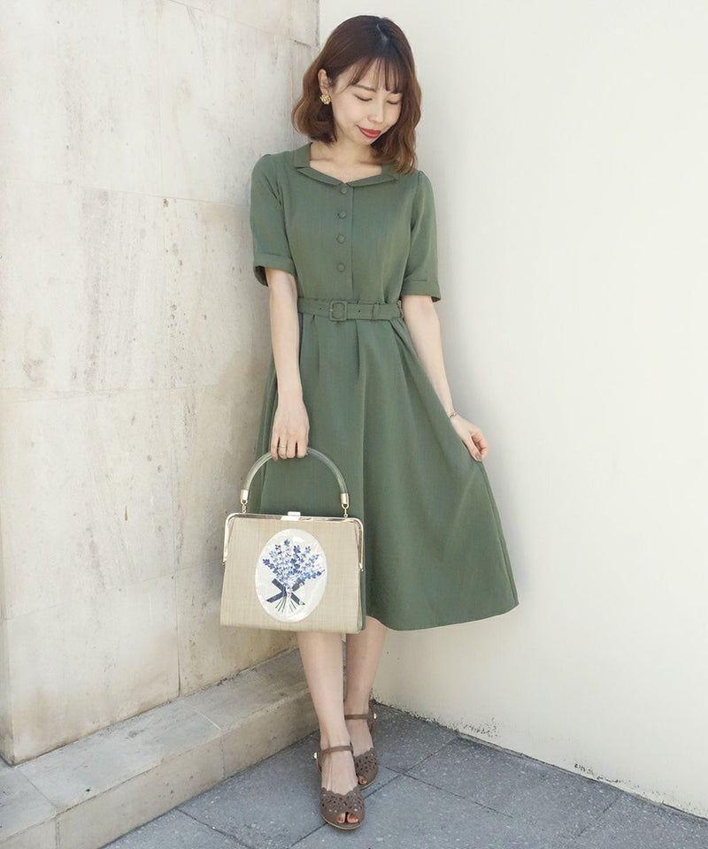 • 《なりたいテイストになれる1着★》 身長152cmの私で膝の少し下あたりです! 普段小さめ~Mサイズを着るのですがこちらのワンピースは肩幅がちょうど良く、ウエストもベルトがあるのでジャストに調節できました♪ スクエアネックと大きすぎない衿が大人で上品な印象◎開衿のベルト付きワンピースはレトロな雰囲気がお好きな方にはとってもおすすめです♪ 首元にスカーフを巻いてサンダルだとclassicな印象が強いですが、ローファー+ソックス合わせでgirlyに、スニーカー合わせでcasualにと、合わせる小物次第でコーデ自在なレトロアイテムです\(^o^)/