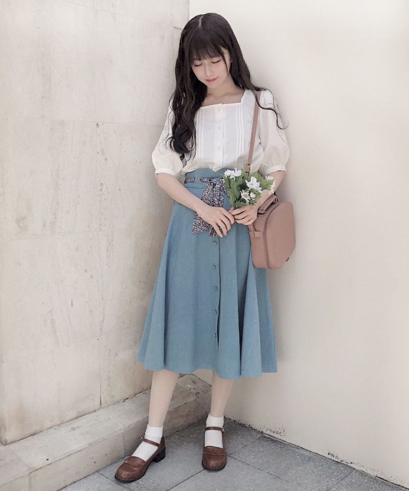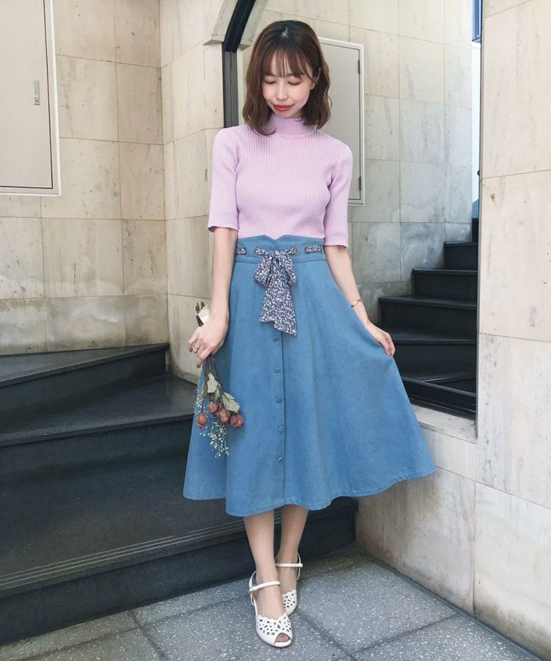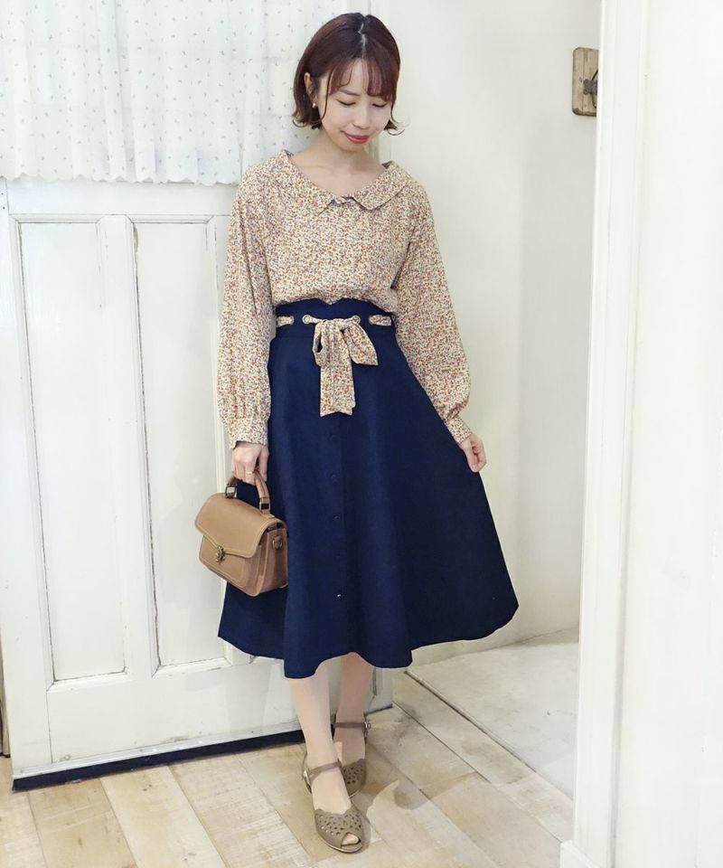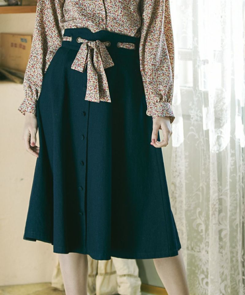 シンプルなトップスでも、合わせるとトレンドライクになるデニムスカート♪ 小花柄のリボンはフロントのみ通っているデザインになっています。(後ろ側まで一周していません) ウエストは、私は158cmで普段Mサイズを着用しますがぴったりフィットしてすっきり見えるサイズ感でした! 硬すぎずやわらかめのデニムの素材感が着心地良いです(^^) スニーカーでも合わせやすいので、カジュアルさんにもガーリーさんにもおすすめです!