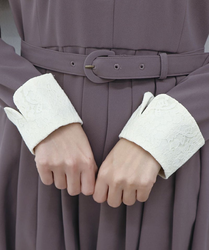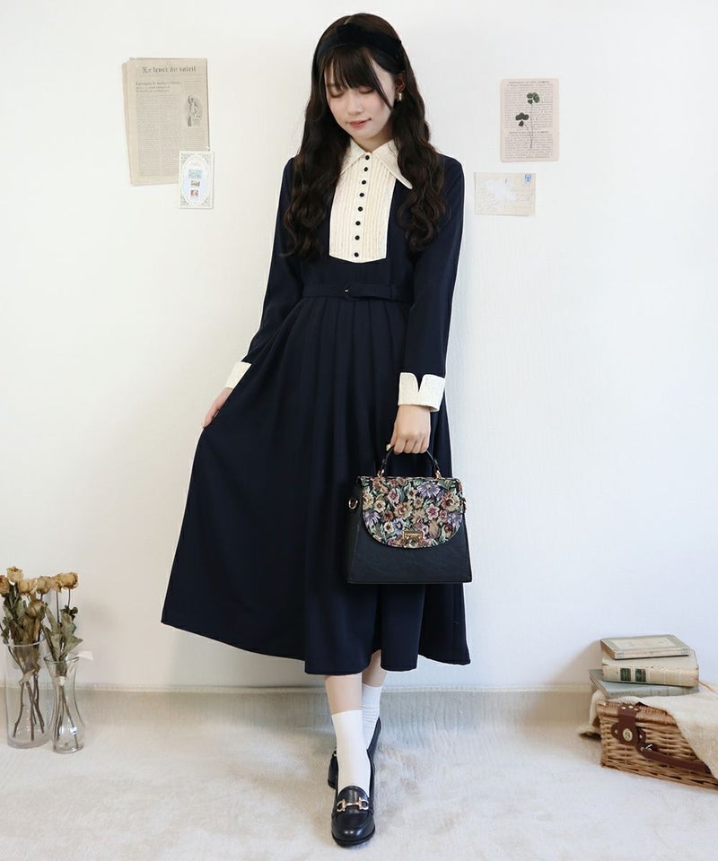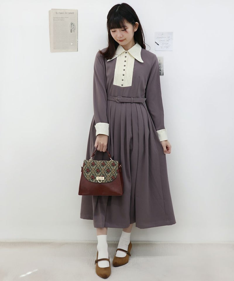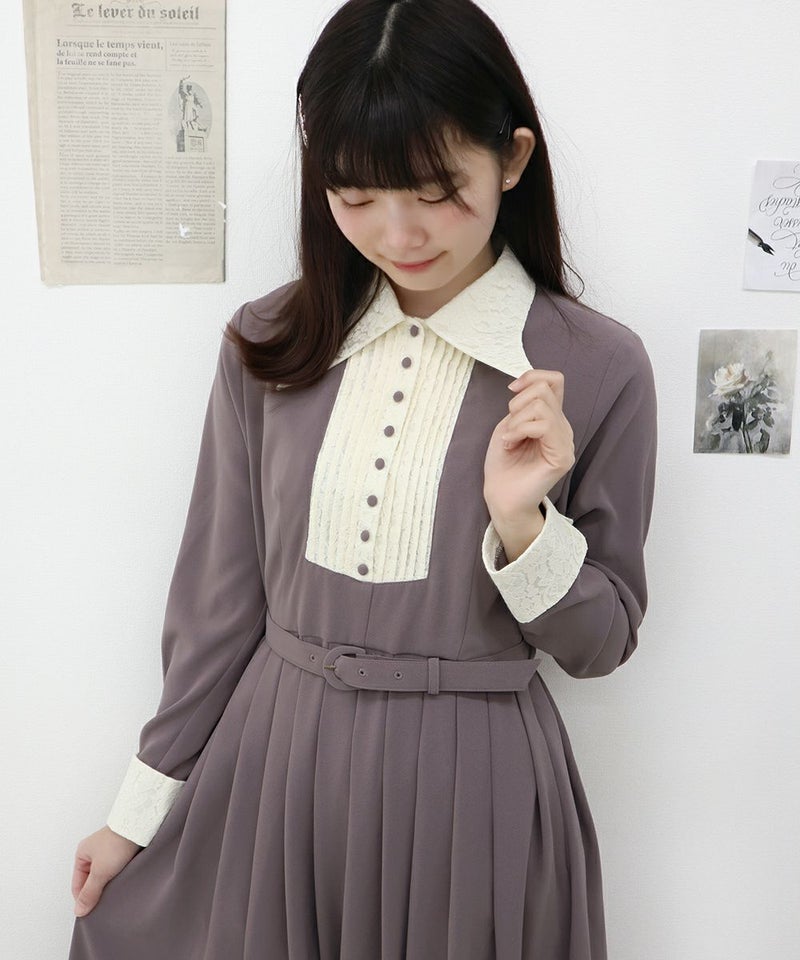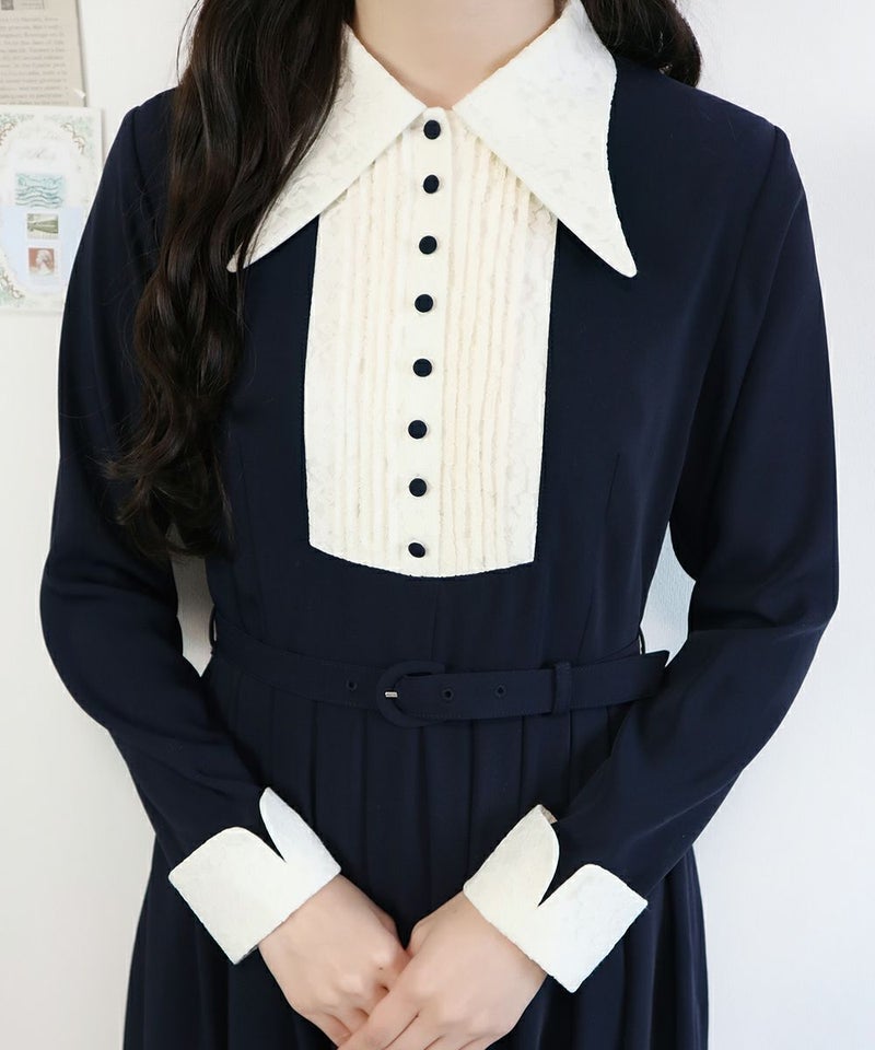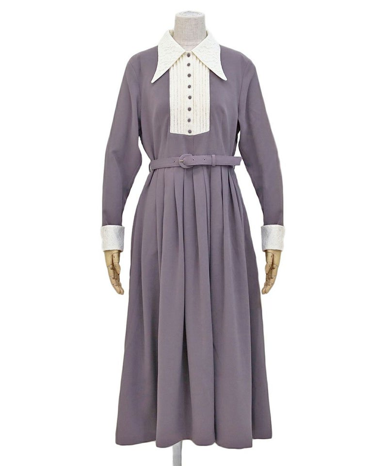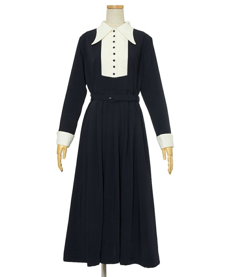 襟元とお袖のレース、胸元の釦、襟の形、ワンピースの丈、ウエストマークのベルト、素敵なデザインとアイテムが沢山詰まったクラシカルなワンピースになります。 ヴィンテージ好きには堪らないワンピースなので、多色買いもお薦めです。