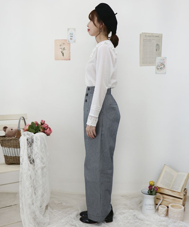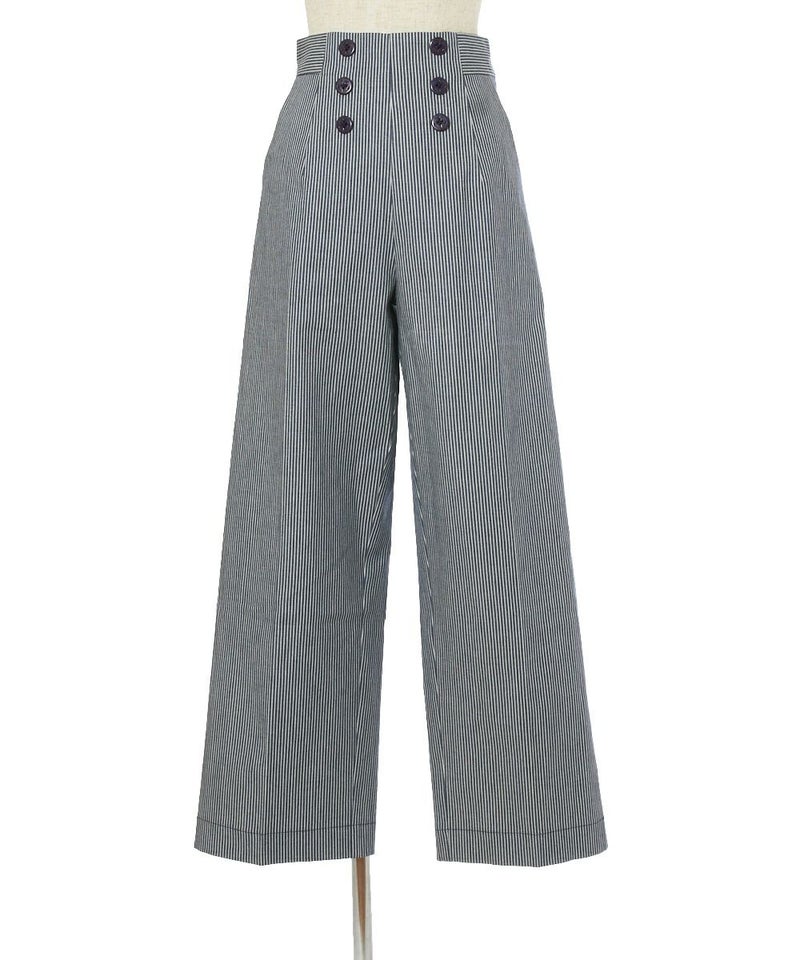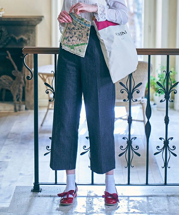 • ウエスト部分のマリン釦がレトロで可愛いです。程よい丈感とセンタープレスで美脚効果があり、シルエットも広がりすぎないのでとても履きやすいです!