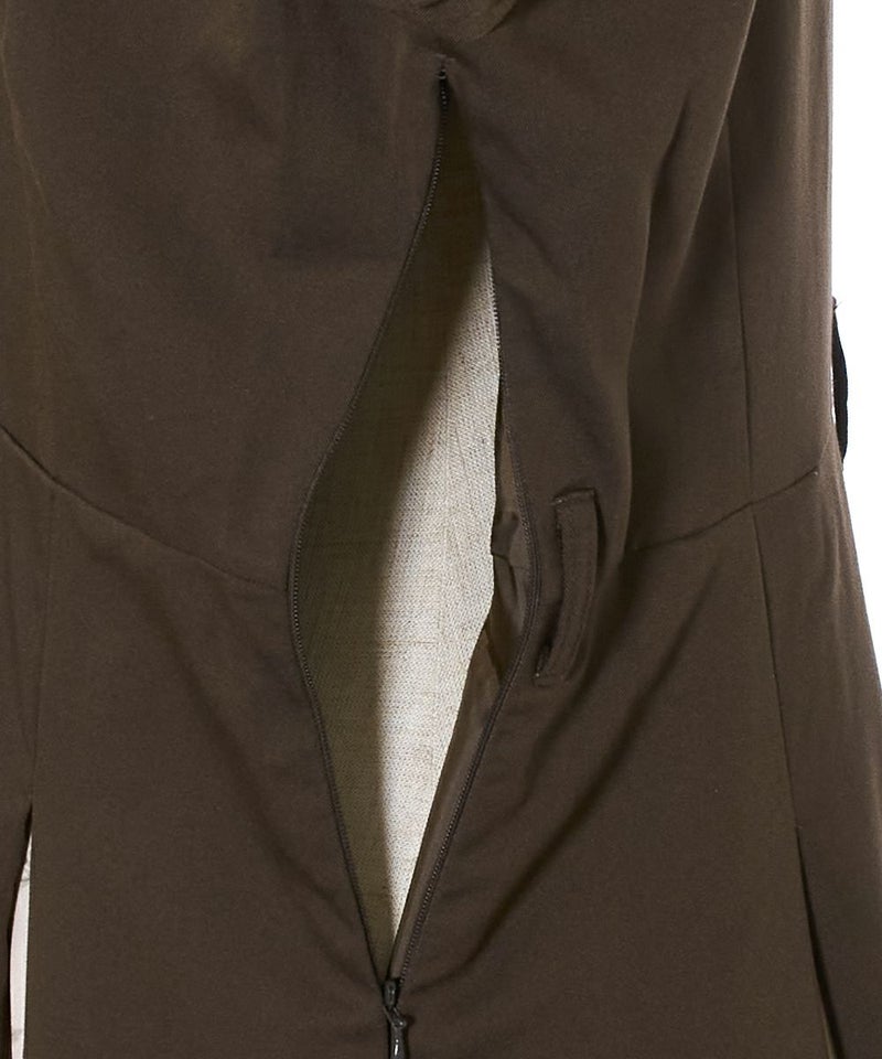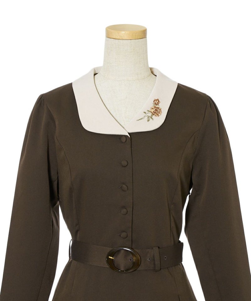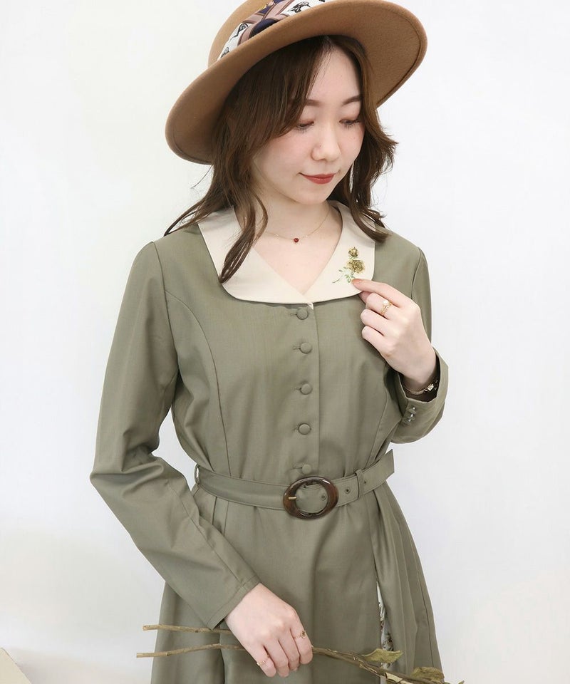 襟元の刺繍とベルトがかわいいです。首元が開いているので寒くなったら薄手のタートルネックを下に着込むのも良さそうです。