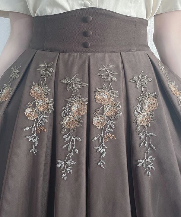 軽い素材感で、今からすぐ着られます。 且つブラウンの色味は秋らしくておしゃれ。 ローズ刺繍がほどよく華やかなのですが、トップスに柄ブラウスを合わせても馴染みます。