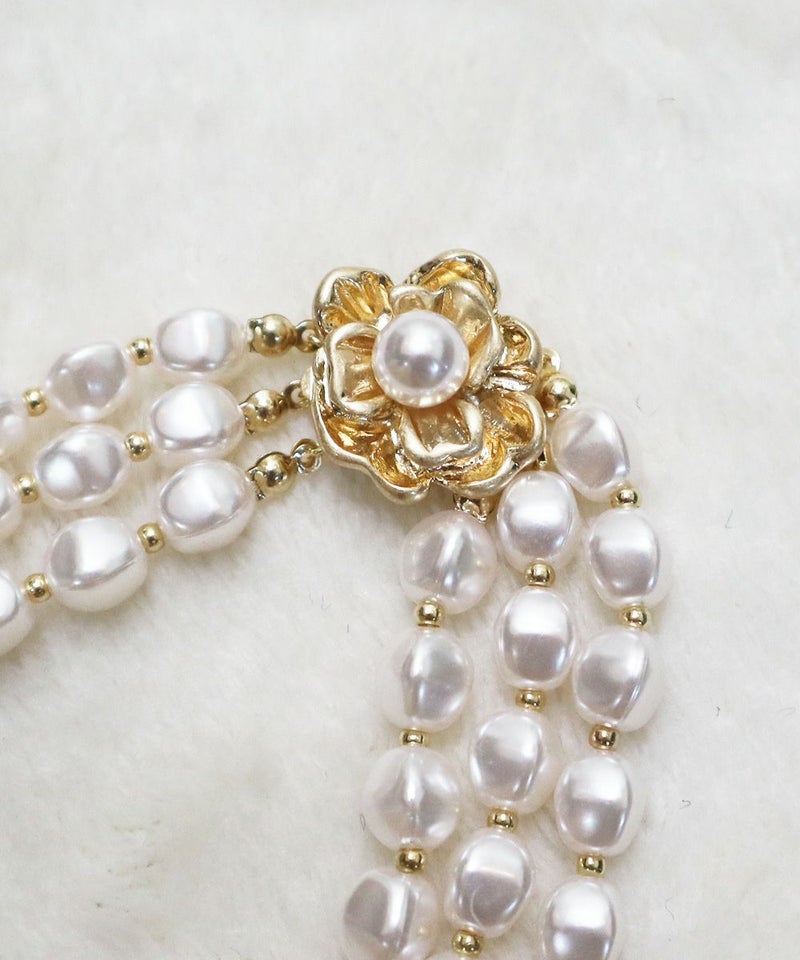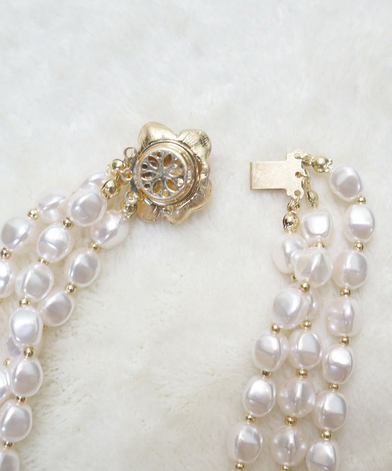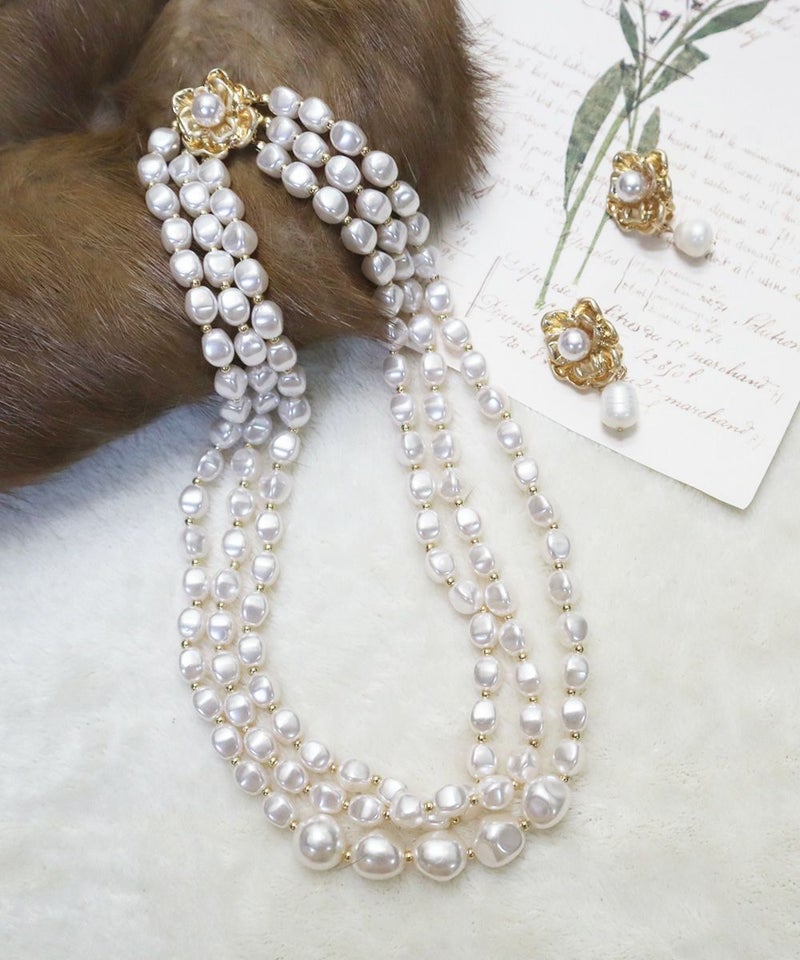多重のバロックパールネックレスが他にはない、ヴィンテージライクな特別感のある一品です。