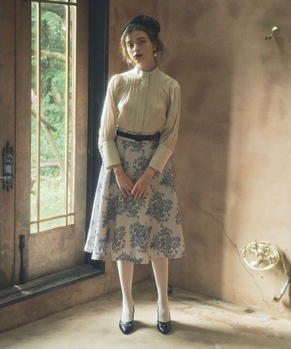 花柄は青みががったグレーで、上品に大人っぽく着こなせます。サーキュラースカートなので、丸く広がるシルエットもお気に入りです。