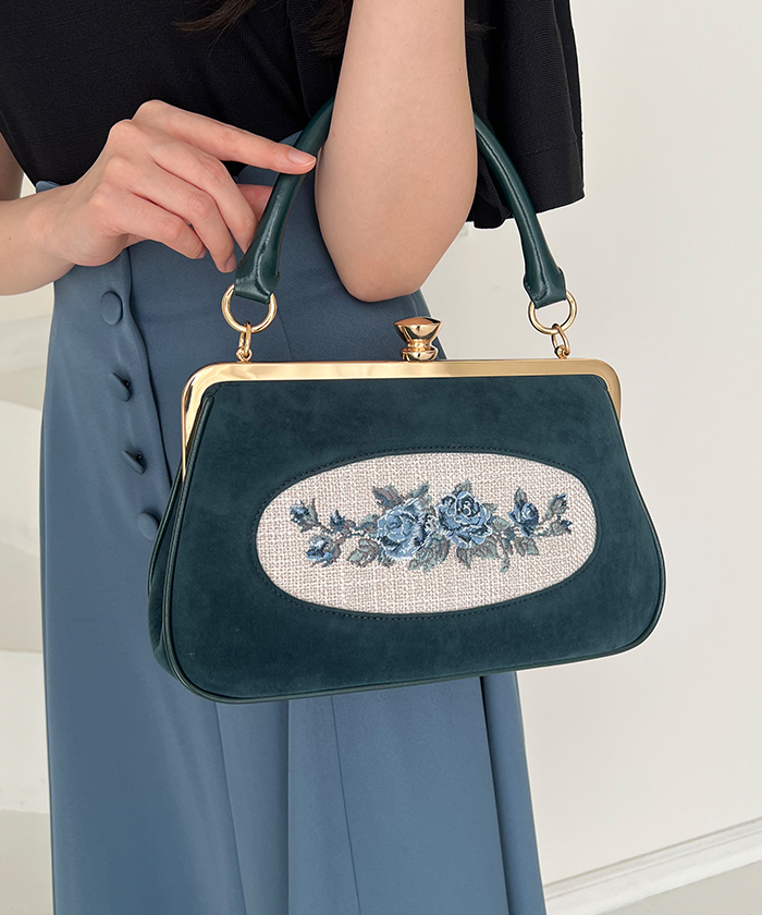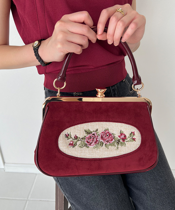 フレームローズ刺繍クロップドがま口バッグ