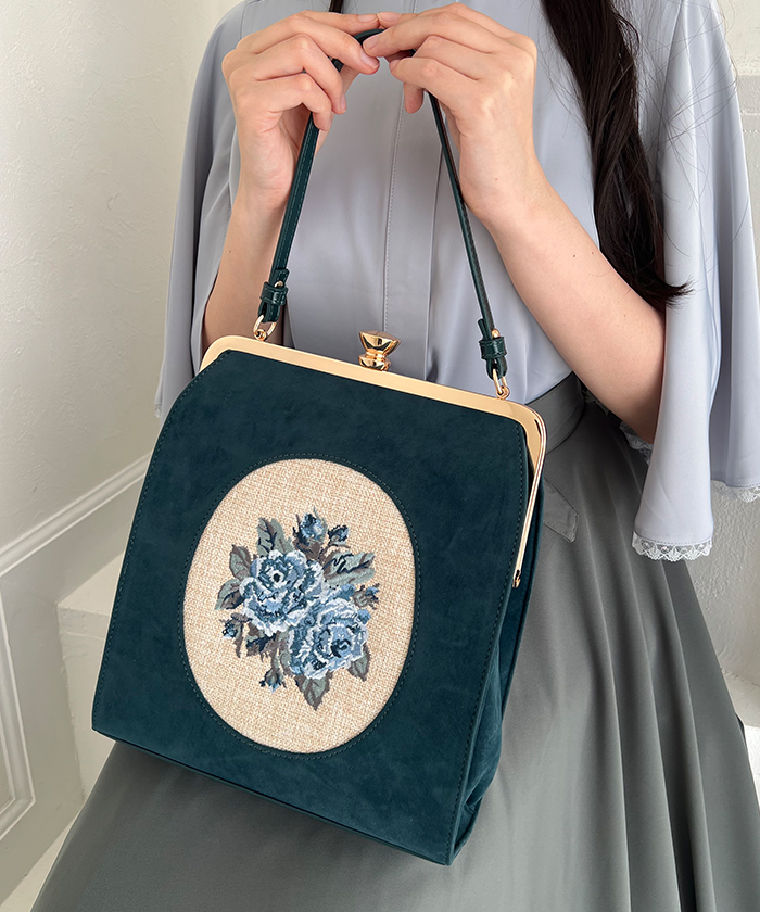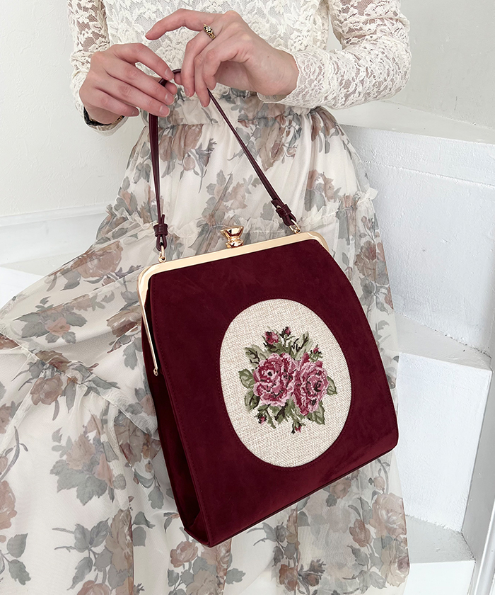 カメオローズ刺繍スクエアがま口バッグ