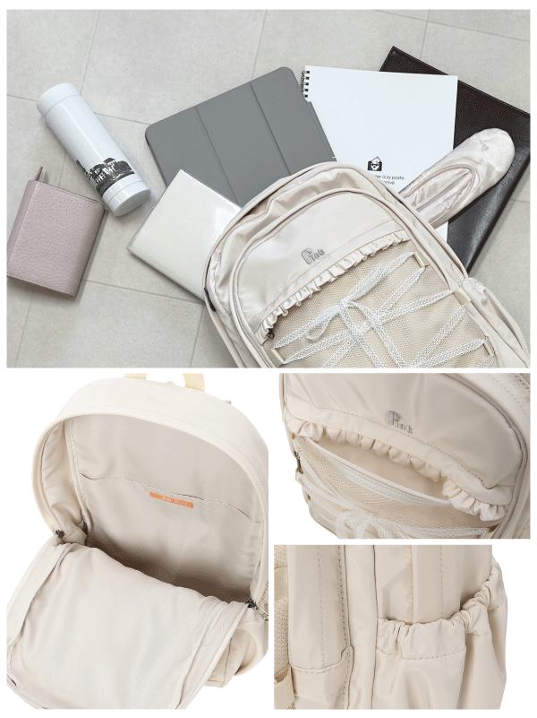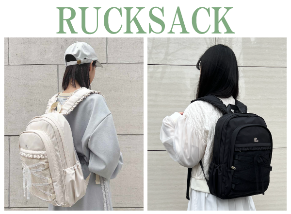 レースアップメッシュポケットリュック ¥12,100(tax in) ivory / black レースアップやフリルデザインなどの ガーリーなディティールを取り入れたリュック。 荷物が多くなってしまう日でも かわいいバッグで気分もあがります♪