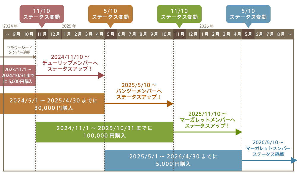 For details on the coupon, see the official online shopping site during the status adaptation period.My pageYou can check more. - Flower member status changes twice a year. (Around May 10th and around November 10th) For more information, please check the "Mechanism of Flower Member Status" below.