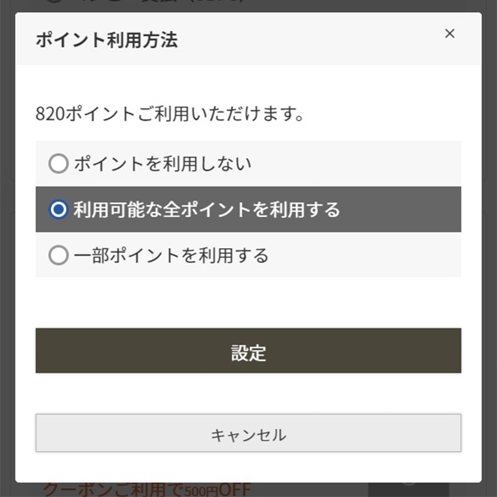 ・ポイント→「利用可能な全ポイントを利用する」にチェックし、「設定」を押す