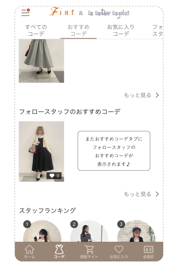 スタッフのフォローやお気に入りコーデなど