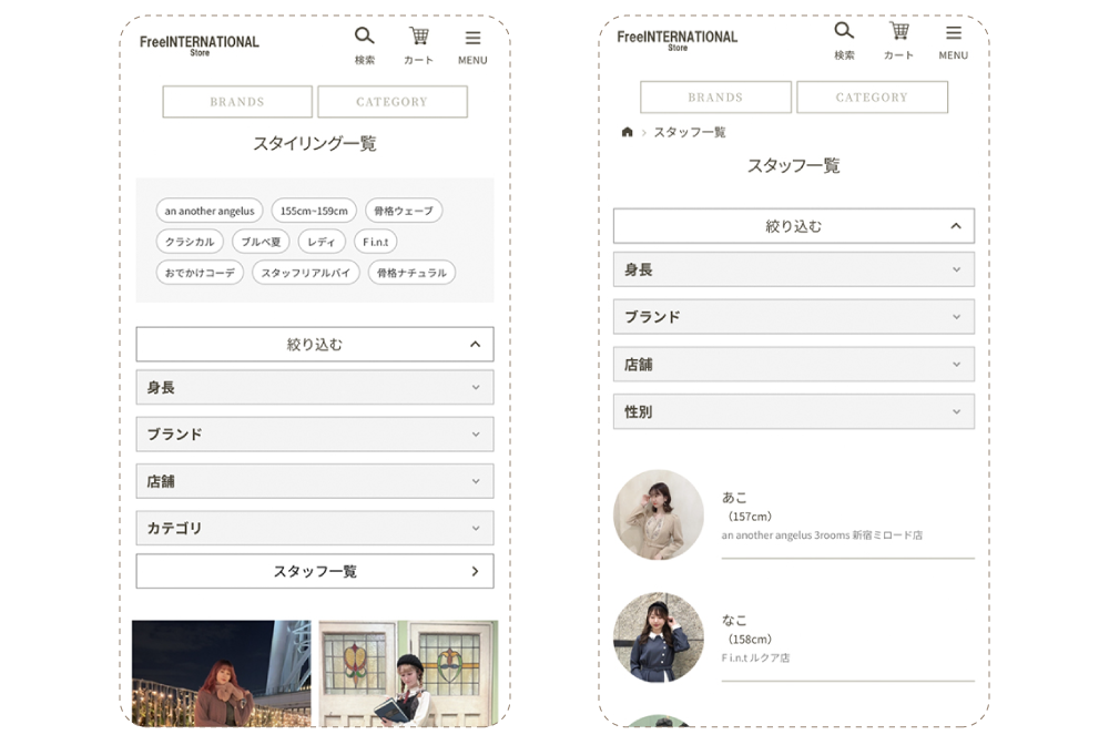 スタイリング一覧、スタッフ一覧どちらからでも